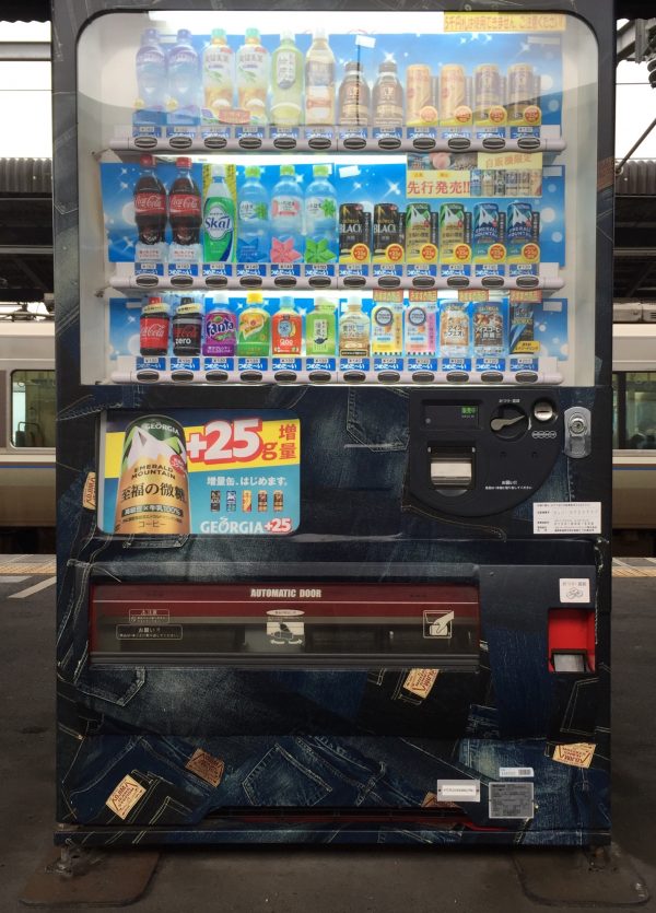 駅のホームの自動販売機もデニム柄だったり、エレベーターの外装もジーンズを思わせるデニム柄だったりと至る所にデニムの聖地を思わせます。
