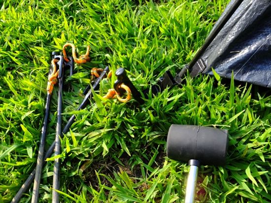 下が土であれば、シートの上に物を置くのは当然として可能であればペグ(キャンプやビーチでテントを止めるのに使う小さい杭)で固定。