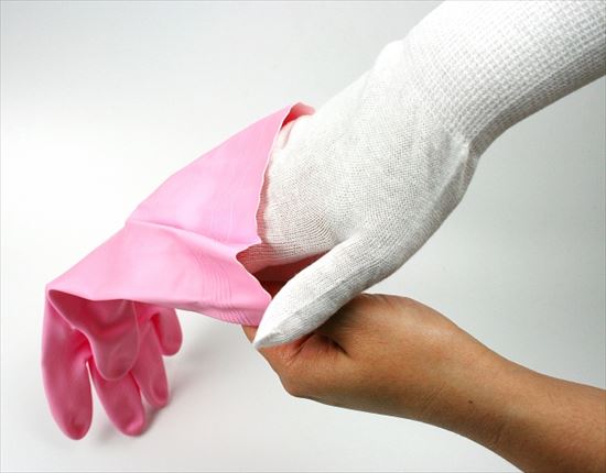 この対策法のポイントは、ゴム手袋で水をカバーして、布手袋(ホームセンター等で“精密作業用手袋”などの品名で販売しています)で、しっかり保湿をするという点です。