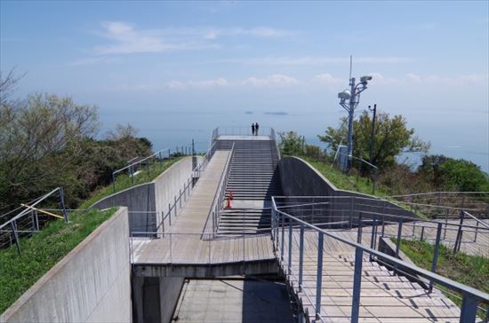 頂上には、建築家の隈研吾氏が設計した展望台があり、ここも360度パノラマで、北西の方向に世界初三連吊橋の『来島海峡大橋』、南には今治の街並み、南東には石鎚連峰などを眼科に感動的な景色が見渡せます。