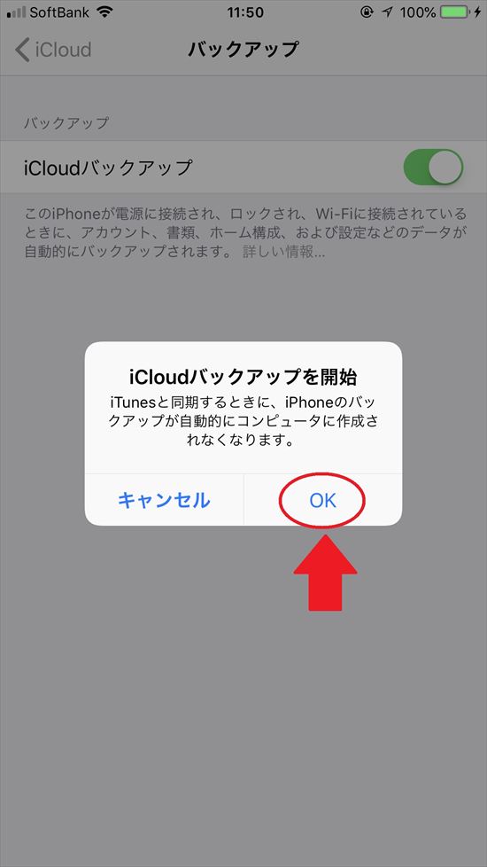 (6)「iCloudバックアップを開始」の確認画面になるので「OK」をタップ。