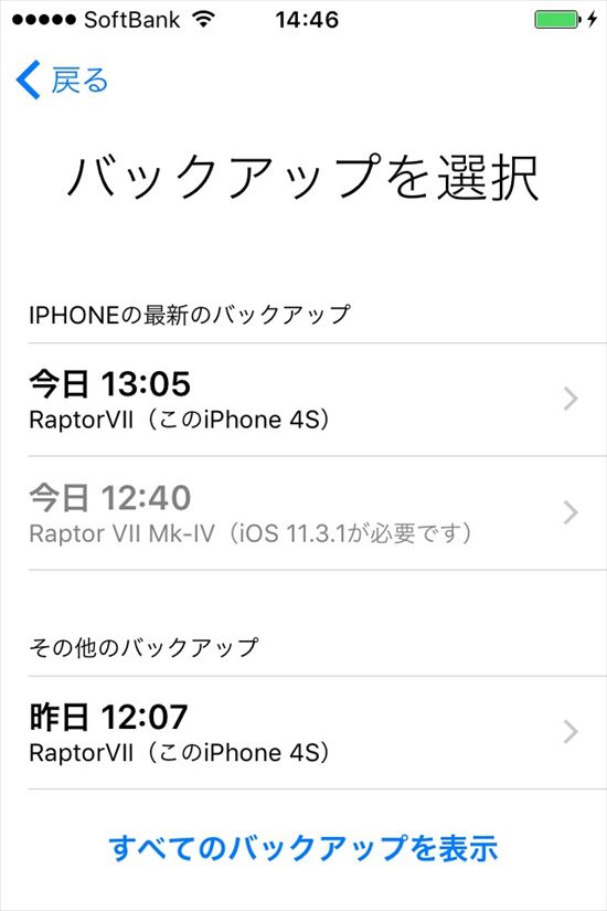 ※復元時の画面だけ古い機種を使用した理由は、非常に私的なものです。筆者が日常で使用しているiPhone7plusを初期化してしまうと、3万曲以上ある音楽ファイルの復元がものすご~く大変で、数日かけないと復元できないからです。なので、日常使いしていない古いiPhone4sに代わりを務めてもらいました。悪しからずご了承ください。
