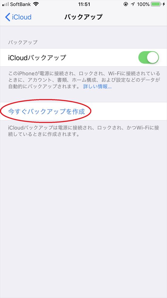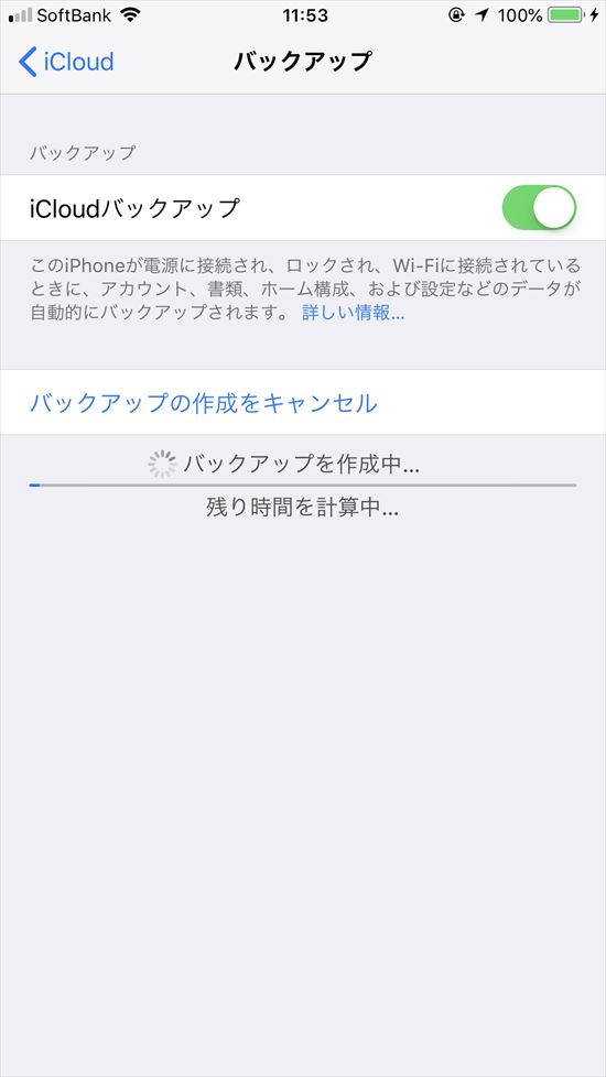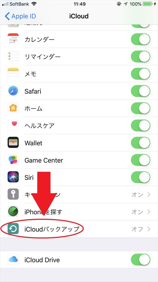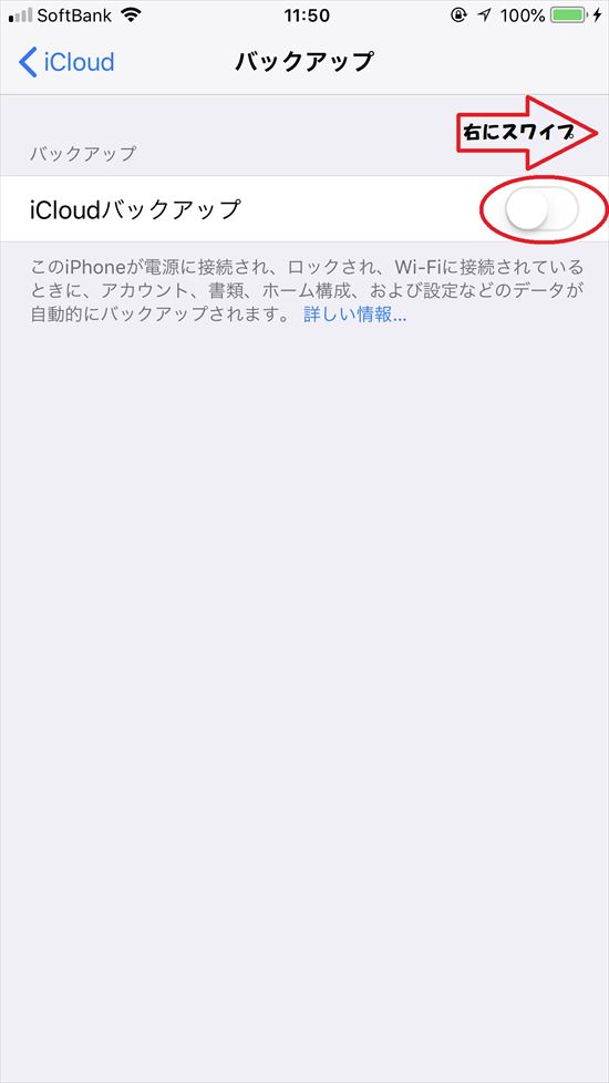 (5)「iCloudバックアップ」のスイッチを右にスワイプしてONにします。