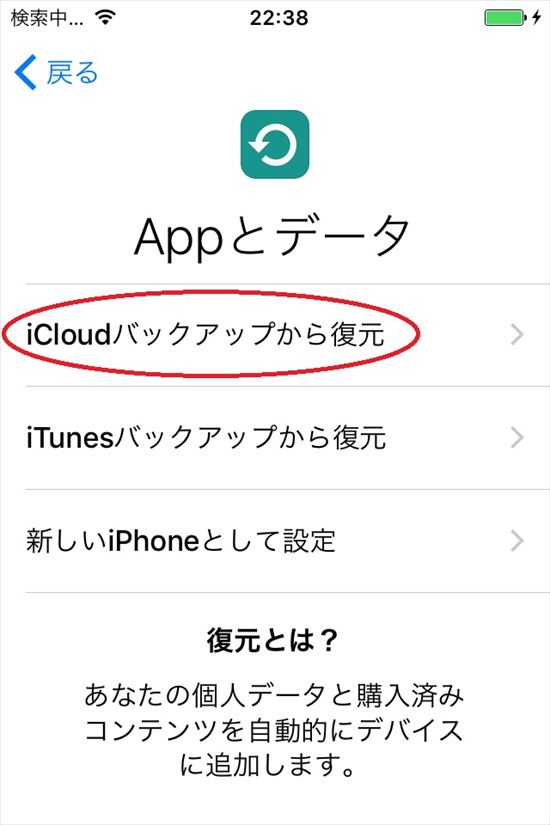 (10)「Appとデータ」画面になるので、「iCloudバックアップから復元」を選択します。
