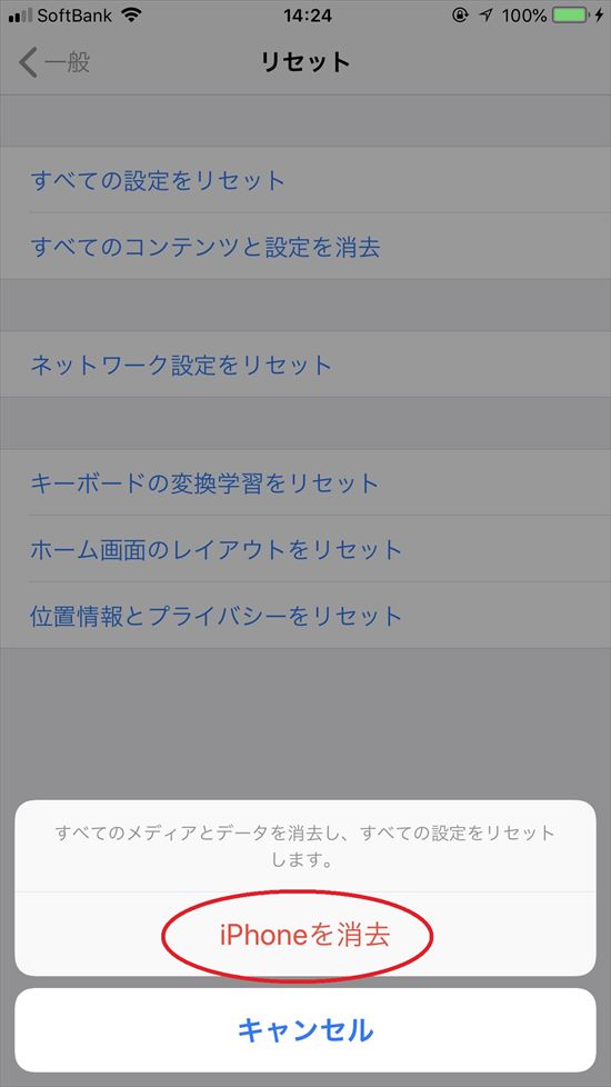 5)「iPhoneを消去」の確認画面が表示されますので「iPhoneを消去」をタップします。もう一度確認を求めてきますので、再び「iPhoneを消去」をタップします。