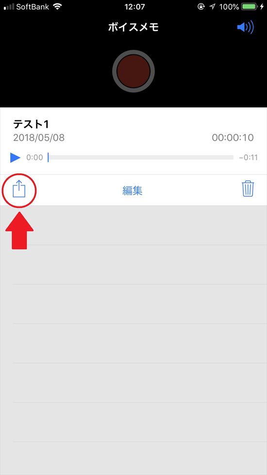 (1)ボイスメモ・アプリで、iCloud Driveに入れたいデータをタップします。