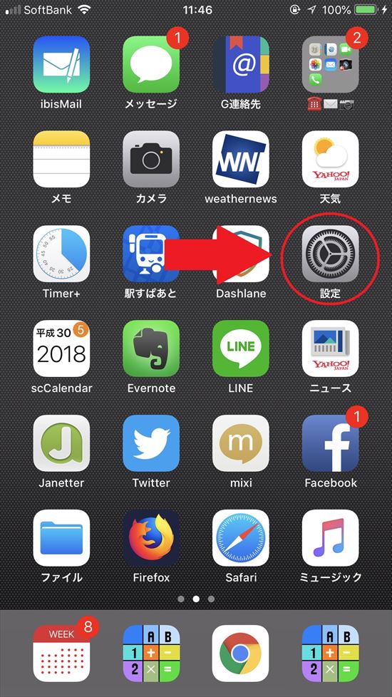 (1)「設定」をタップします。「設定」アイコンの位置は利用者のホーム画面の設定によって異なります。