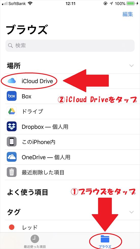 (7)「ファイル」を開き、ブラウズ画面になっていなければ、ブラウズ画面になるように「ブラウズ」をタップし、「iCloud Drive」をタップします。