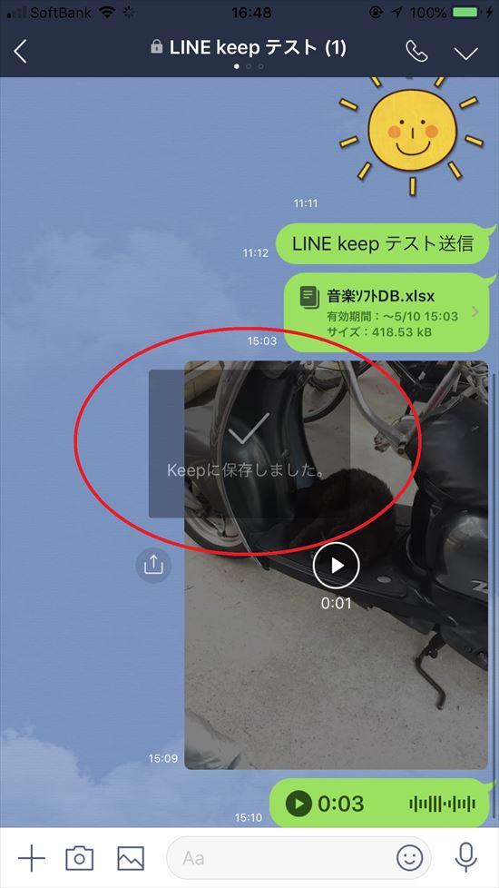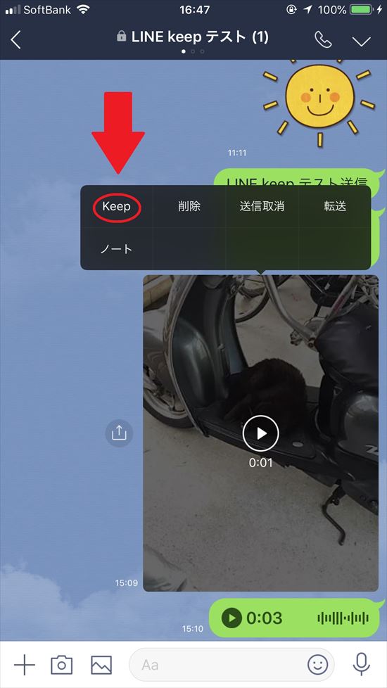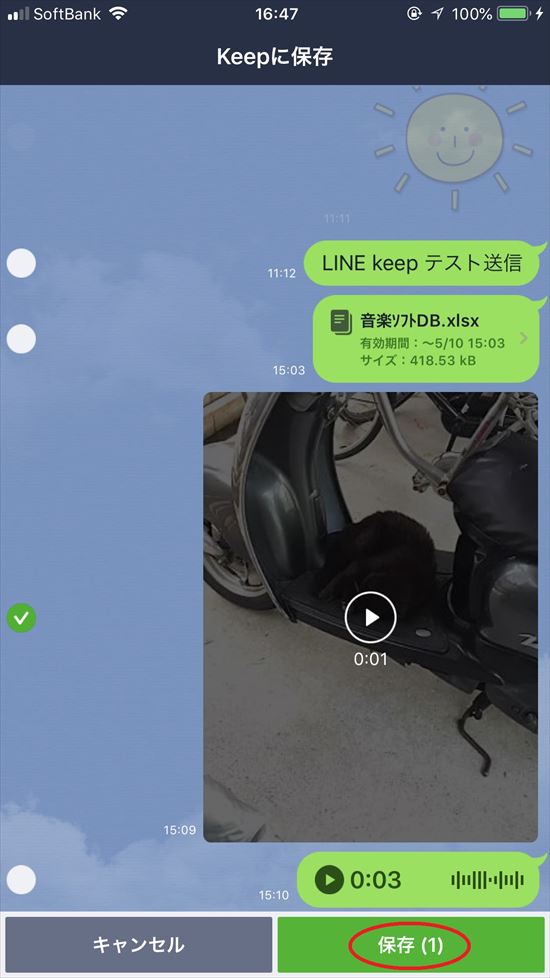 保存できるものは、トークに表示されているものなら何でもOK。「メッセージ」、「画像」、「動画」、「音声メッセージ」、全てKeepできます。