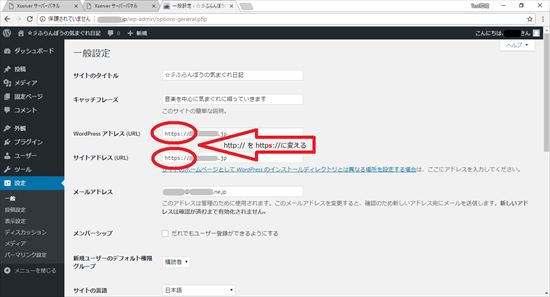 14.「WordPress アドレス (URL)」と「サイトアドレス (URL)」の“http://”を”https://”に変更します。