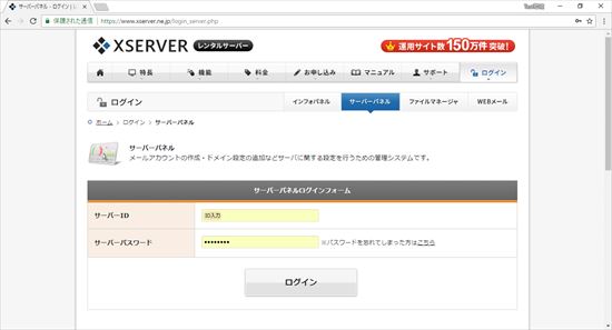 1.まず以下のURLにアクセスしエックスサーバーのサーバーパネルにログインします。