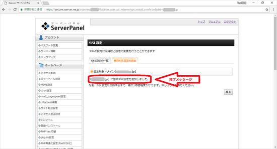 7.「独自SSL設定を追加しました」というメッセージが表示されれば正常です。