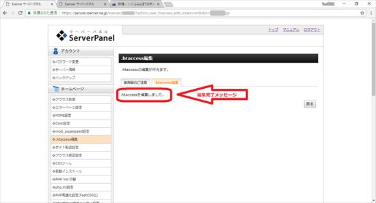22.「.htaccessを編集しました。」と言う画面になったら完了です。”http://”のアドレスにアクセスし、”https://”の画面が表示されることを確認します。