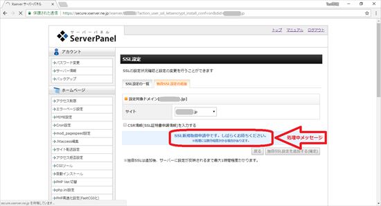 6.SSL新規取得中のメッセージが表示されます。
