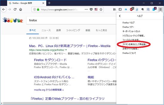 3. ヘルプ・メニューから「アドオンを無効にして再起動」をクリックします。
