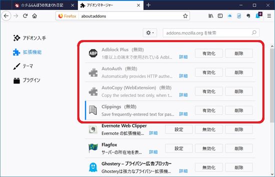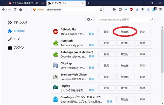 例えば、まず上半分の拡張機能を無効にしてFirefoxを再起動します。