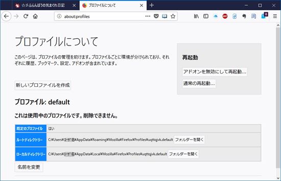 また、「Firefoxをリフレッシュ」や「Firefoxのプロファイルを新たに作り直し」の作業で、プロファイルの場所を知りたい場合は、アドレス・バーに「about:profiles」と入力するとプロファイル管理画面になります。