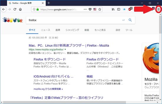1. Firefox画面の右上のメニューボタンをクリックします。