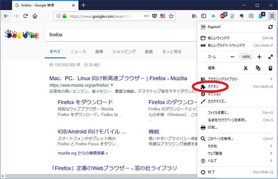 2-1. メニューボタンをクリックして表示されるメニューから「アドオン」をクリックします。
