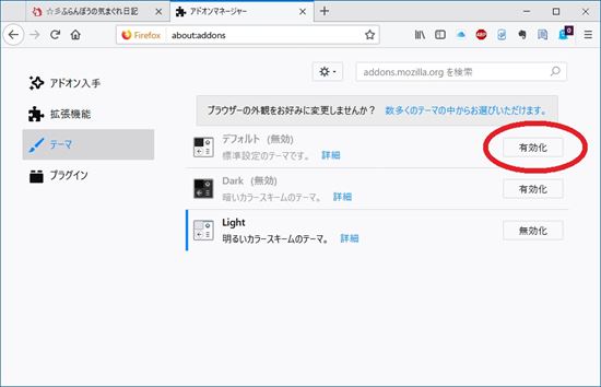 再度Firefoxを起動し、問題が発生しないようならば、それまで選択されていたテーマに何らかの問題があったということになります。