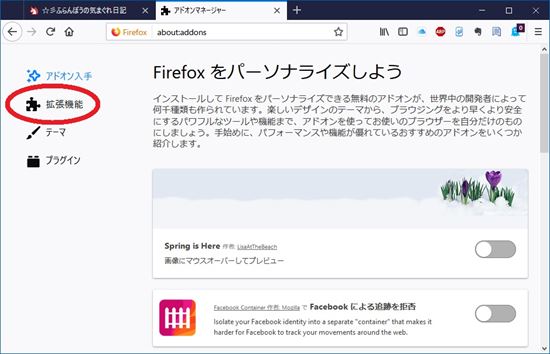 3-1.メニューボタンをクリックして表示されるメニューから「アドオン」をクリックし、アドオンマネージャーの画面の左のタブから「拡張機能」をクリックします。