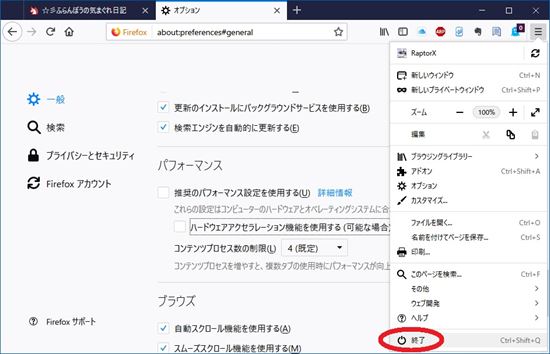 1-5. メニューボタンをクリックし、メニューの一番下の「終了」でFirefoxを終了させます。