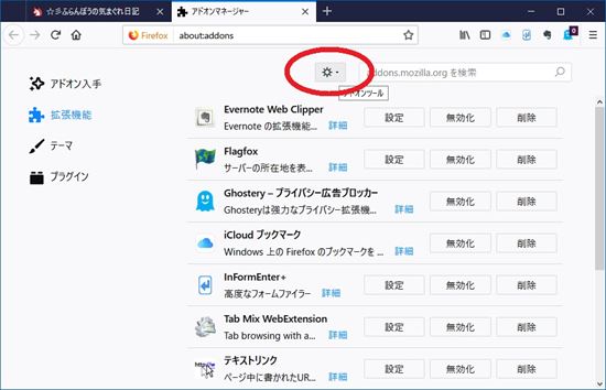 3-4.アドオンマネージャーの拡張機能が表示されている画面で、「アドオンツール」ボタンをクリックします。