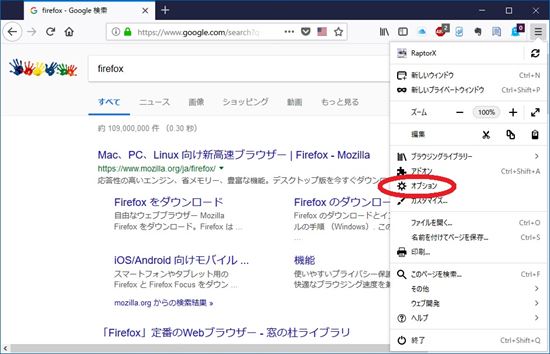 1-1. メニューボタンをクリックして表示されるメニューから「オプション」をクリックします。