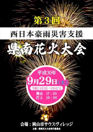 岡山県で開催される花火大会の多くが自粛ムードだったのですが、西日本豪雨災害を支援したいという主催者の県南花火大会実行委員さまの決断により決定いたしました。