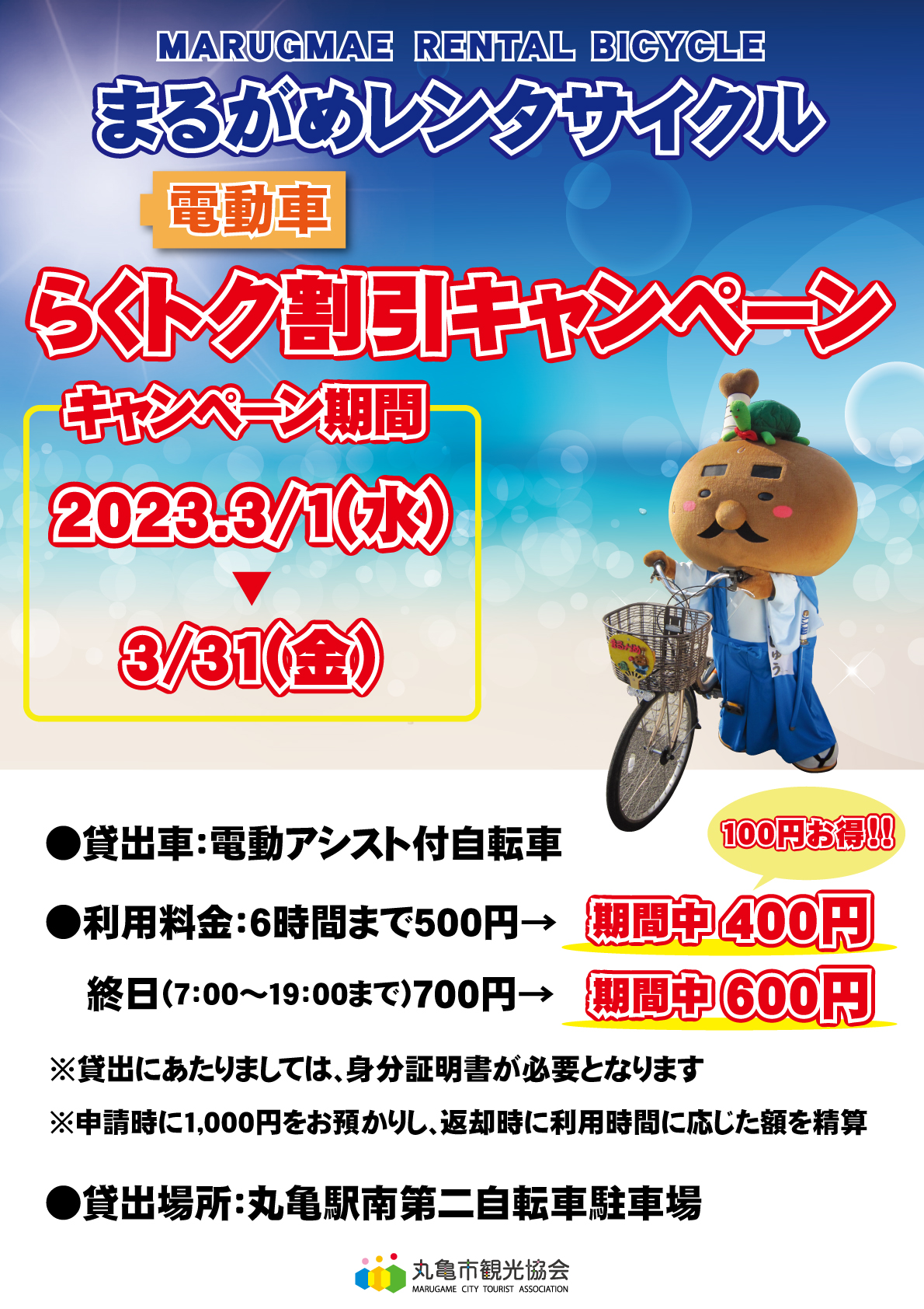 利用料金:普通自転車1日500円、電動アシスト自転車1日1,500円です。